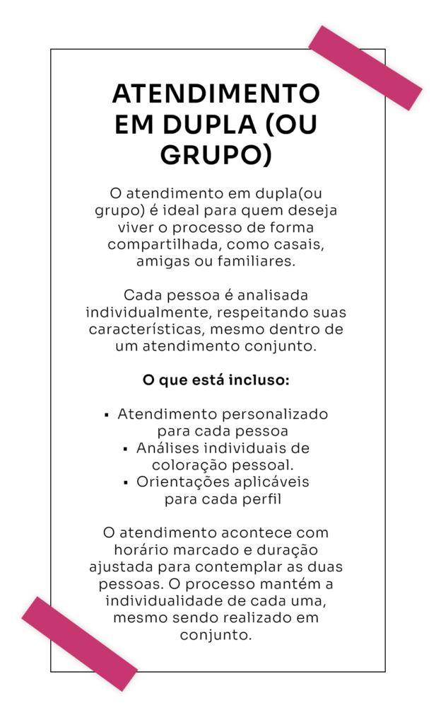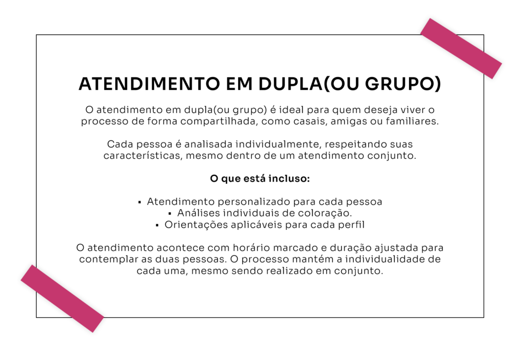 O atendimento é realizado com horário marcado de maneira presencial em um dos locais de atendimento e começa com uma análise cuidadosa da sua coloração natural. Durante o processo, você entende na prática como as cores se comportam em você e como utilizá-las de forma mais consciente.